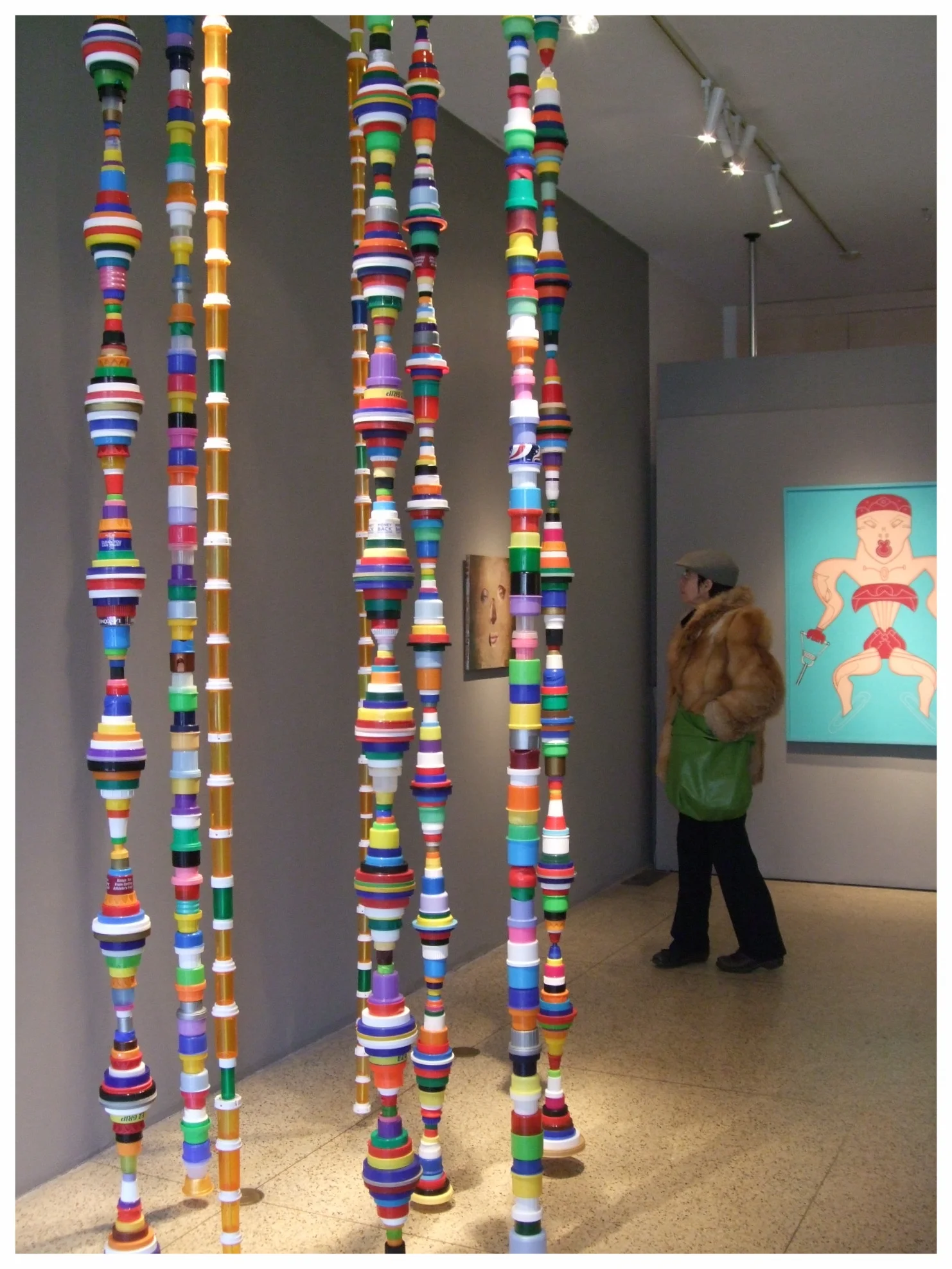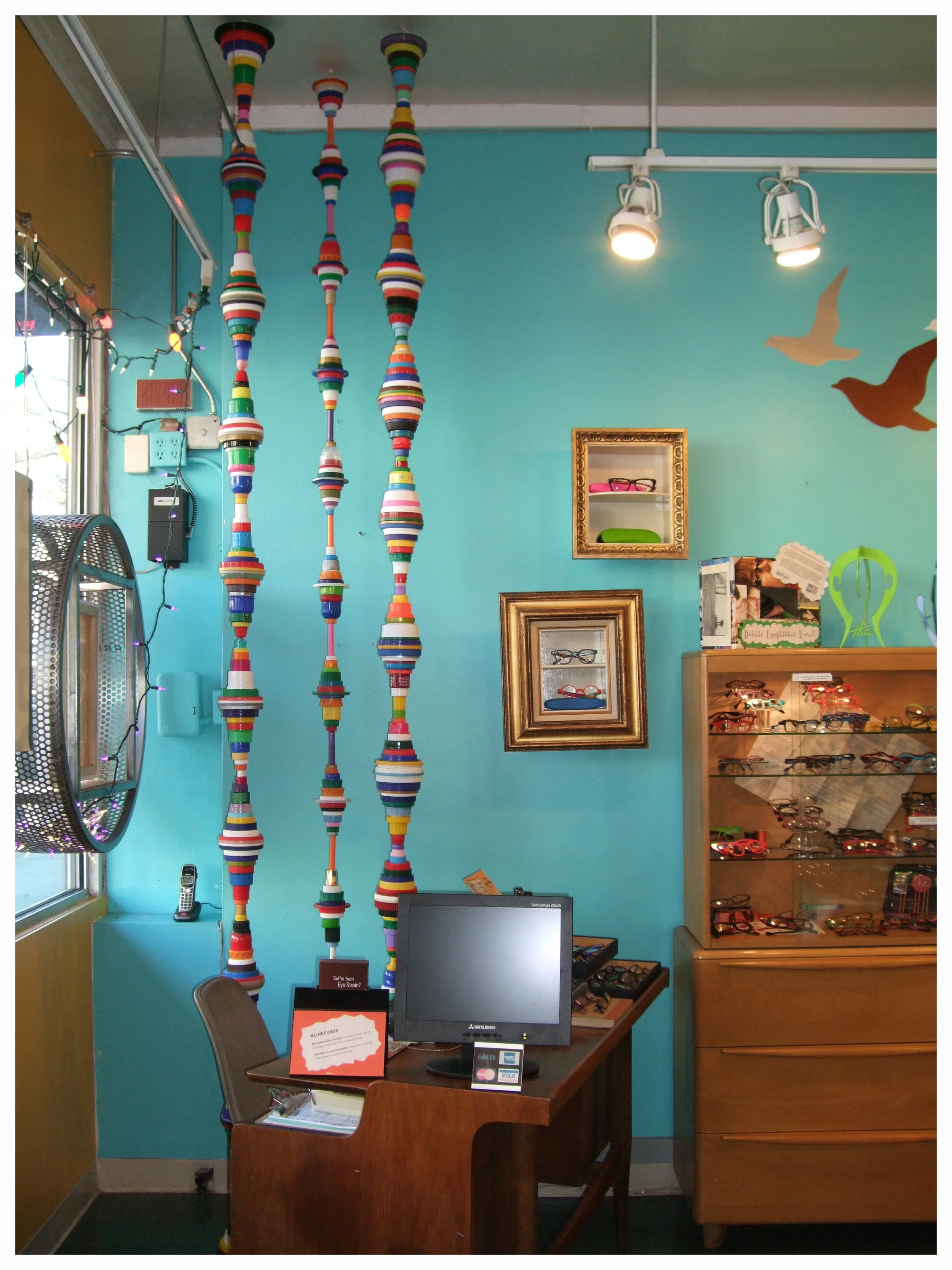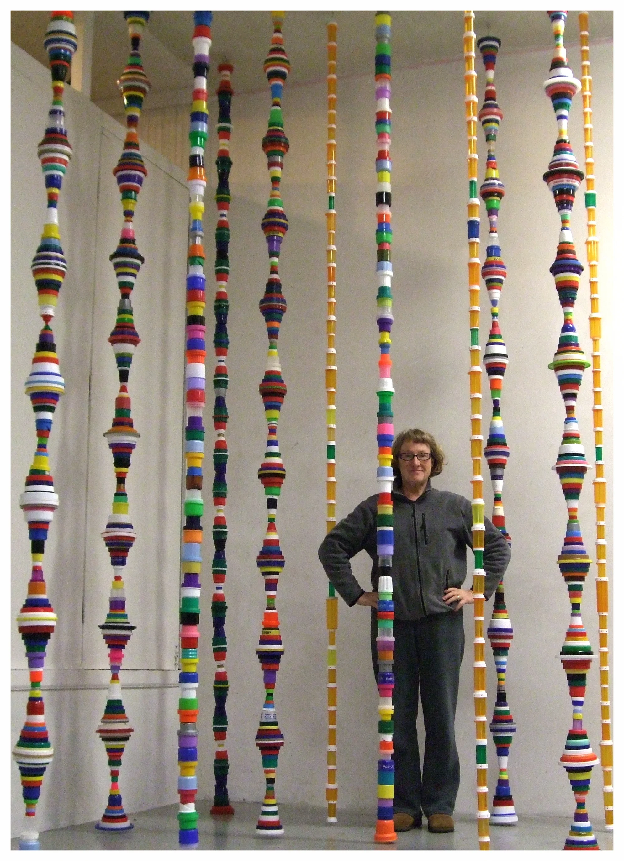 Plastic bottle caps, like plastic bags, are a plastic product that can’t be/isn’t recycled. Mary Ellen conceived of an endless column of these caps and jar lids, after Constantin Brancusi’s iconic modernist sculpture. One became two, and two became many. They are in several private collections. All images © 2010 - 2015
