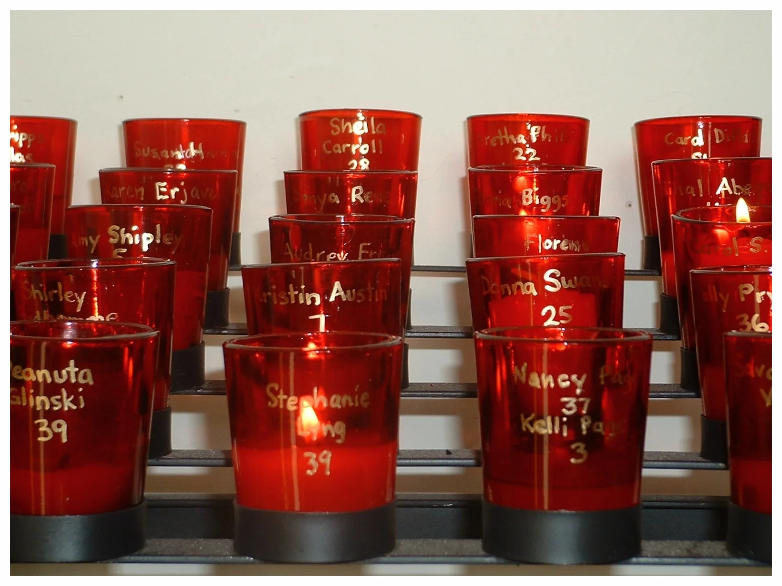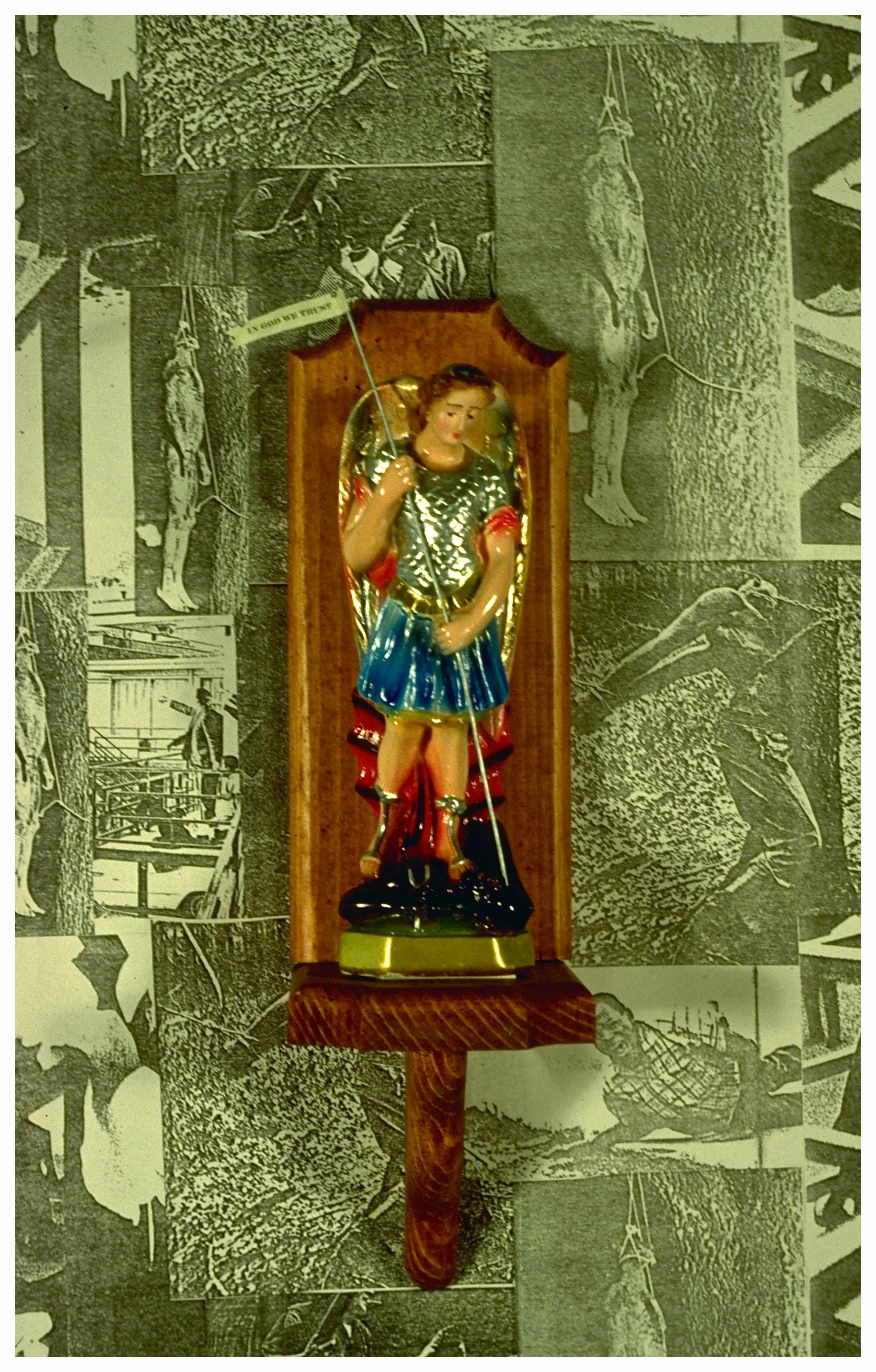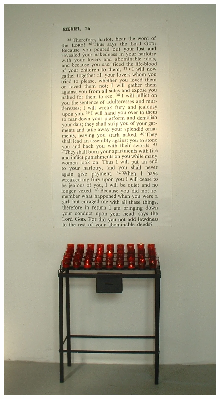 Women on a Pedestal is modeled on traditional statues of Mary, but covered over with news reports of women and girls’ murders, suggesting we are not honored in this society but rather raped, abused and killed because we are female. Martyrs text is from Ezekiel 16:35-43, wherein the “jealous” god compares Israel to a slut who must be punished by hacking and beating and burning. Underneath, vigil candles are inscribed with names from the same articles. Viewers are invited to light a candle in memory of these martyrs.