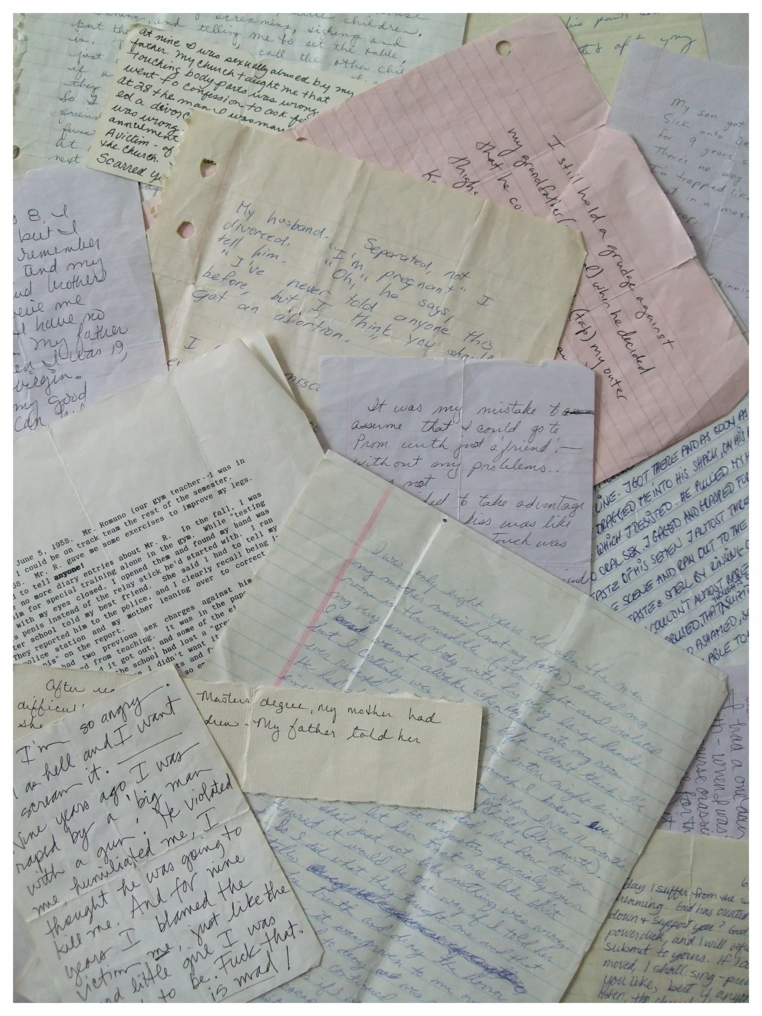 Women’s Wailing Wall is a mock-up of the wailing wall in Jerusalem, wherein men file their petitions to god. In this version, it is a place where women can tell all those stories that we are supposed to keep to ourselves. While both men and women are invited to read the anonymous stories tucked into the cracks, women only are invited to add their own. She made this installation because every one of her women friends had a horrendous story of rape or abuse, while each thought she was alone in her pain. She represented these stories as a book, Testimony from the Wailing Wall, with stone covers weighing about 10 pounds each. The stone must be physically overturned to get to the contents.