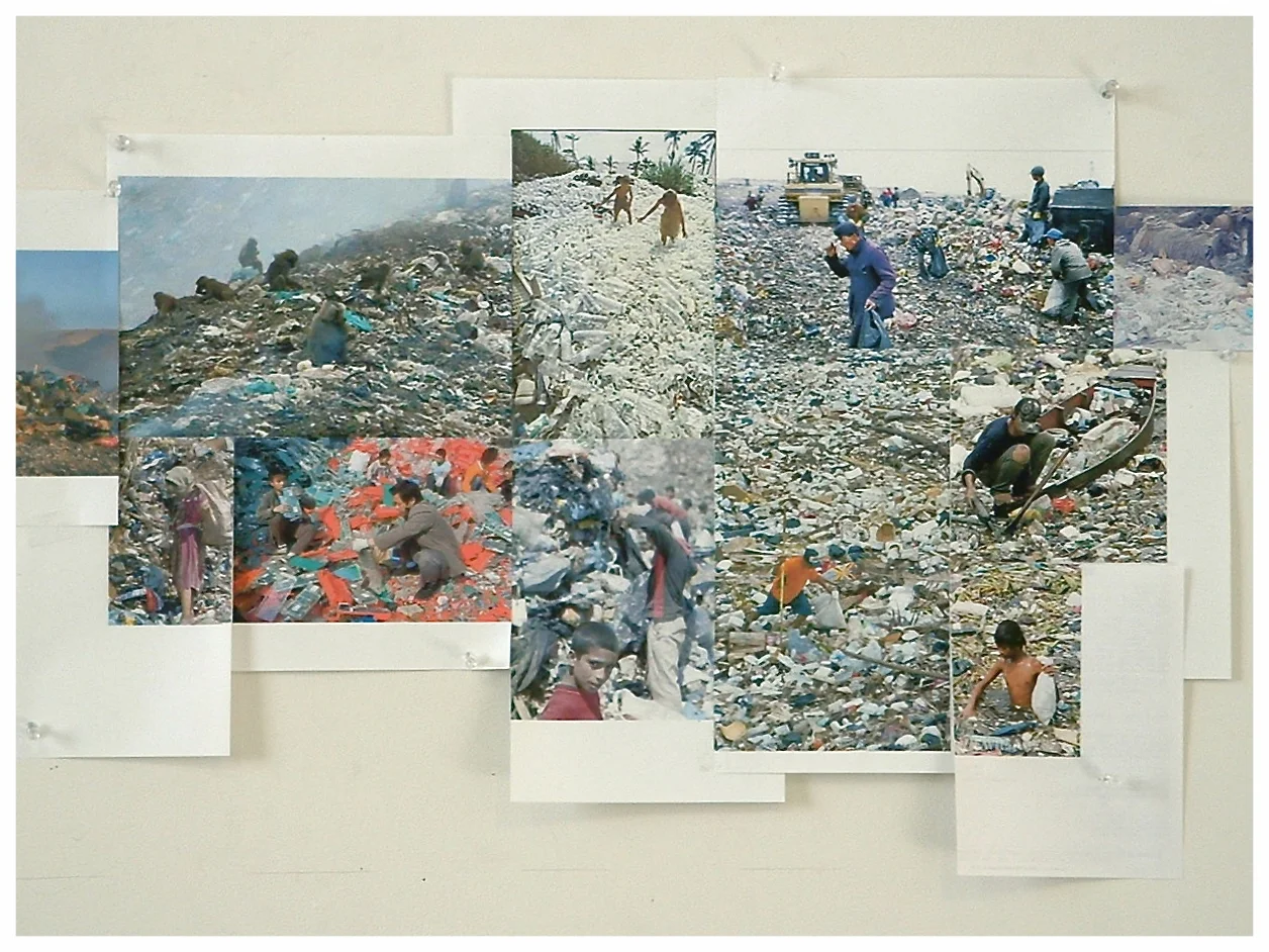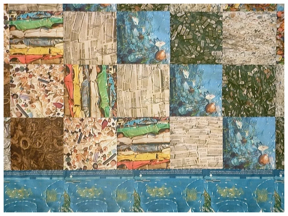 Mountains (©2008), is a series of found photos of trash arranged in a mountain range of human design. The piles include electronic waste, plastic and metal, mountains of cattle dung from feed lots, and nuclear waste. Living Mountain (©2008) explores the impact of waste, much of it from developed countries, on people in the third world. Found images of trash are also used in Trash Quilt (©2008), a traditional quilt made from non-traditional fabric, as if to suggest we are sleeping under all this garbage we are making.